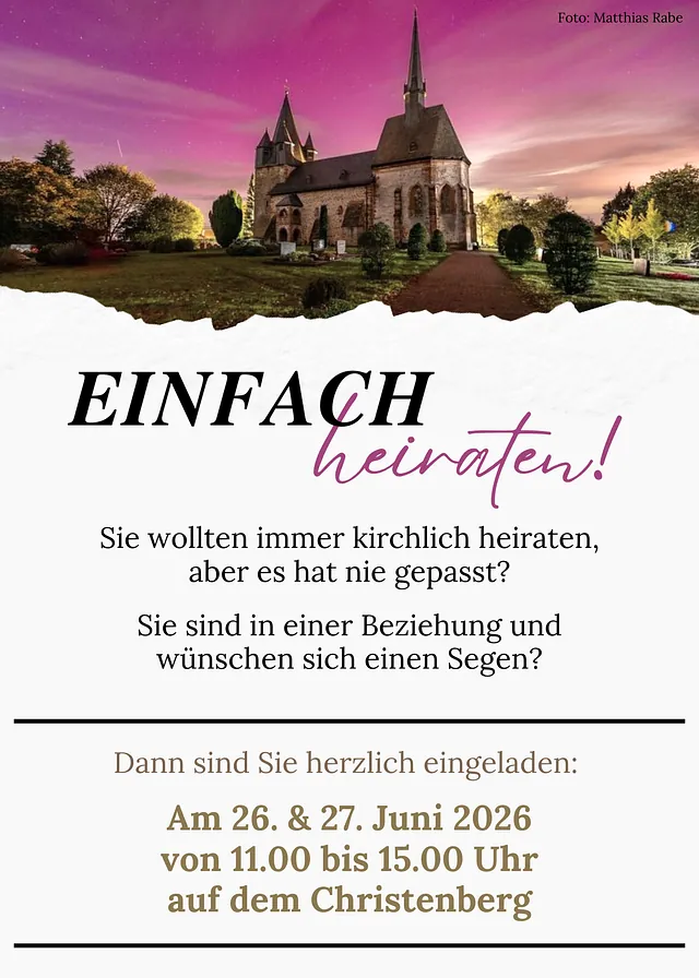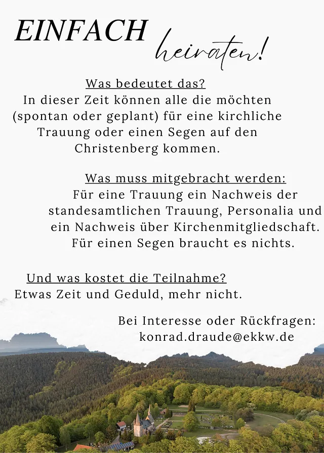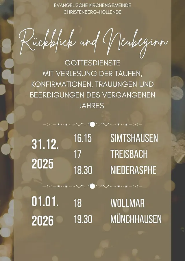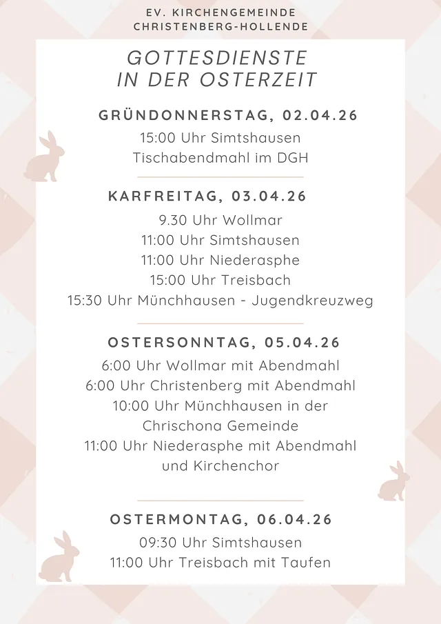 Zum 1. Januar 2025 haben sich die bis dahin selbstständigen Kirchengemeinden Münchhausen, Niederasphe, Simtshausen, Treisbach und Wollmar zu einer gemeinsamen Kirchengemeinde vereinigt. Der Name der neuen Kirchengemeinde "Christenberg-Hollende" deutet schon an, dass wir mit diesem Zusammenschluss versuchen wollen, viele Gemeinsamkeiten und Unterschiede in unserer Region unter einem gemeinsamen Dach zusammenzubringen.